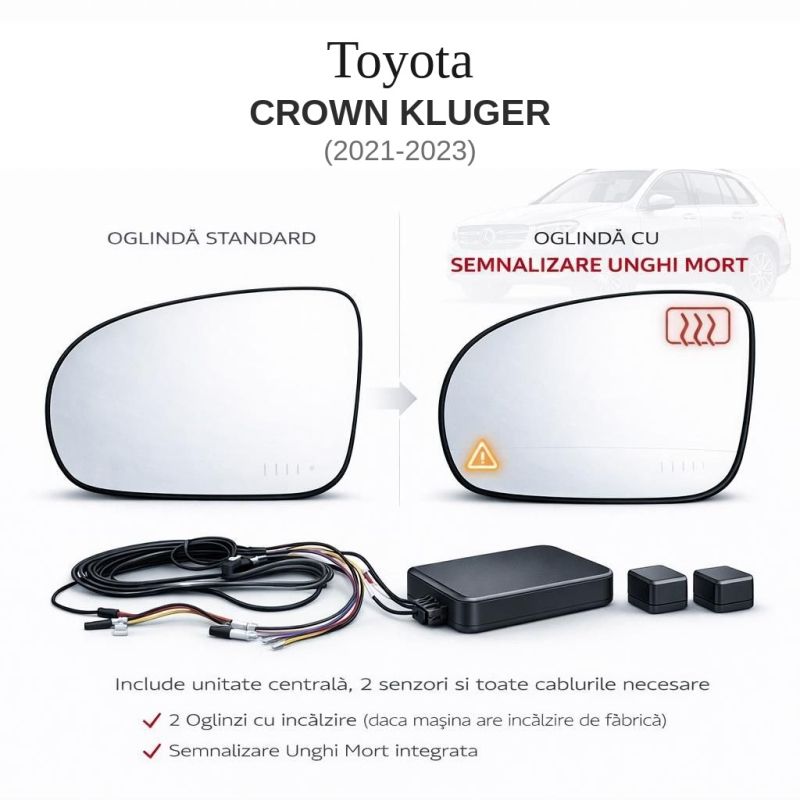 Kit complet senzori unghi mort dedicat pentru Toyota CROWN KLUGER (2021–2023). Include 2 oglinzi cu LED de avertizare integrat, 2 senzori radar 24 GHz, unitate de control și cablaj. Montaj direct pe suportul original, fără modificări. Oglinzi cu încălzire păstrată. Sistem dedicat, nu universal.